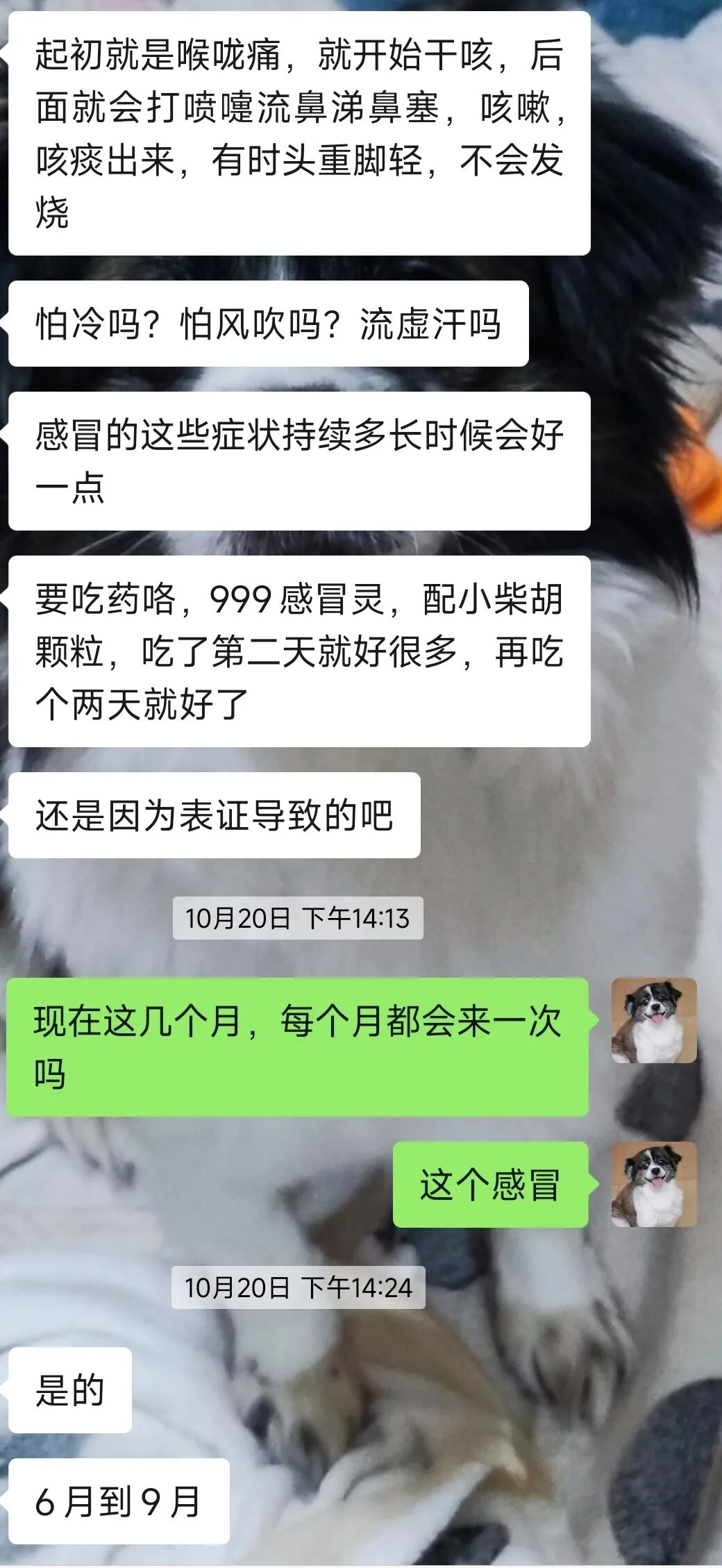 既往感冒时:起初就是喉咙痛,就开始干咳,后面就会打喷嚏流鼻涕鼻塞,咳嗽,咳痰出来,有时头重脚轻,不会发烧。自行服用小柴胡颗粒及999感冒灵会好得快。经过追问,既往感冒多发在经期前后,这是比较关键的一个点,医生不可不知。