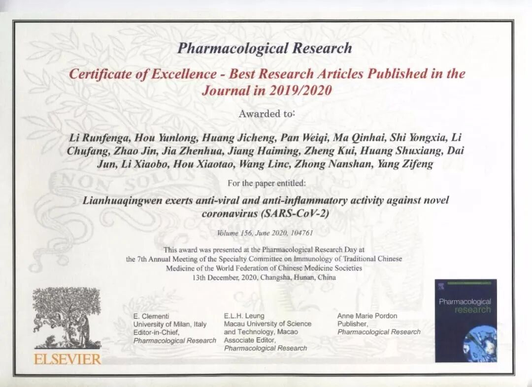 论文《连花清瘟对新型冠状病毒具有抗病毒、抗炎作用》被国际期刊《药理学研究》评选为2019-2020年度全球优秀论文奖