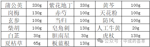方中蒲公英、紫花地丁清热泻火,解毒散结,为君药。黄芩清热燥湿,泻火解毒;天花粉清热泻火,生津润燥;玄参清热凉血,解毒散结;夏枯草清火散结,板蓝根清热凉血、解毒利咽,人工牛黄清热解毒,胆南星化痰散结,虎杖清热利湿、凉血解毒,柴胡、防风疏风清热,此十味辅助君药疏风散邪,清泄里热,共为臣药。赤芍、当归、皂角刺、白芷合以活血化瘀,消肿排脓,均为佐药。岗梅为清咽利喉要药,且有引经作用,为使药。诸药合用,共奏疏风清热,解毒消肿之效。