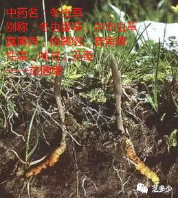冬虫夏草的主要成分包括虫草酸、虫草素、氨基酸、甾醇、甘露醇、生物碱、维生素 B1 、B2 、多糖及矿物质等。具有抗癌、滋补、免疫调节、抗菌、镇静催眠等功效。传统医学《本草从新》记载:"味甘性温,秘精益气,专补命门。