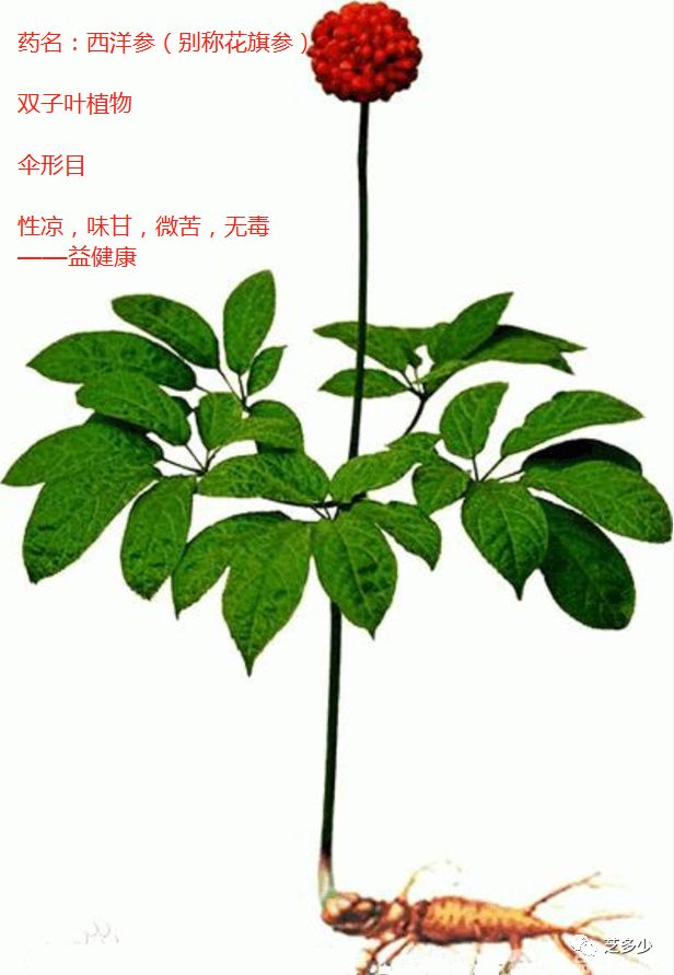 甘、微苦,寒。归肺、心、肾、脾经。补气养阴,清火生津。主要成分为人参皂甙、挥发油、树脂等。西洋参茎叶中尚含人参皂甙Rh1,含量为0。001%左右。