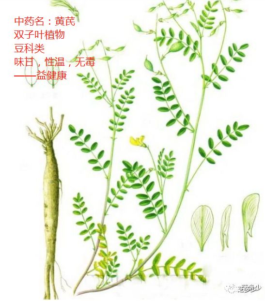 甘,微温。归脾、肺经。补脾肺气,升阳举陷,益卫固表,利尿,托毒生肌。黄芪为豆科植物蒙古黄芪膜荚黄芪的干燥根。含氨基酸、粘液质、糖类、苦味素、胆碱甜菜碱叶酸、熊竹素,β-谷甾醇(、黄芪多糖等。凡癌症患者因脾肺气虚所致面色白光白,倦怠无力,纳少便溏,吐血便血,咳喘气短,痰多稀白,少气懒言,乏力自汗,心悸失眠,气虚发热,浮肿尿少等均可用之。《本草害利》云:"黄芪极滞胃口,胸胃不宽,肠胃有积滞者勿用……