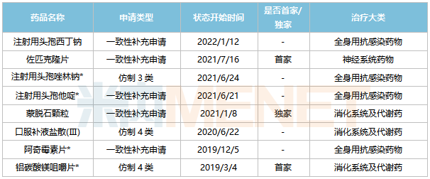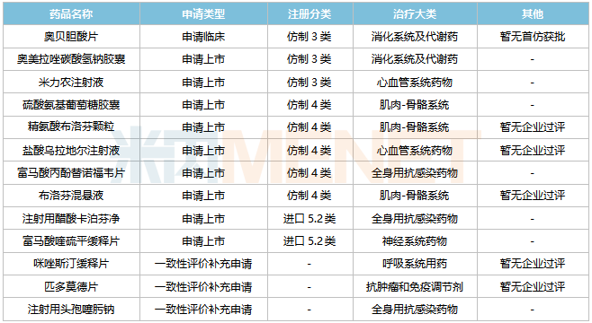 在审的一致性评价品种中,10个品种以新注册分类提交上市/临床申请,其中奥贝胆酸片暂无首仿获批;3个品种提交一致性评价补充申请,其中咪唑斯汀缓释片、匹多莫德片暂无企业通过或视同通过一致性评价。