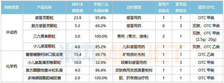 米内网数据显示,在2021E中国城市实体药店终端,预计华润三九有多个OTC品种在同类中处于领先地位,包括感冒中成药感冒灵颗粒、胃药中成药三九胃泰颗粒、矿物质补充剂葡萄糖酸钙锌口服溶液等。