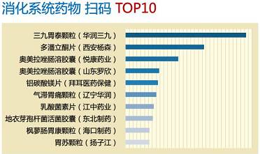 消化系统疾病中,西药与中成药平分秋色,华润三九胃泰颗粒凭借其强大的品牌价值拔得头筹,西安杨森多潘立酮片(吗丁啉)紧随其后。