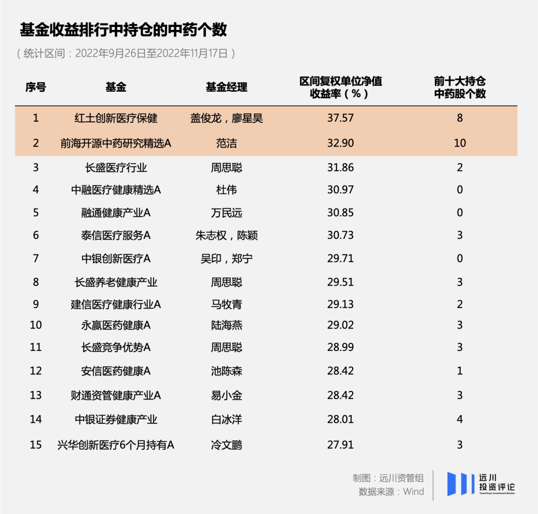 如果观察9月26日医药行业见底以来,业绩排名前列的医药基金经理,十大持仓中多数持有2个以上中药股。其中涨的最好的红土创新医药基金基本单押了中药行业,持有了8只中药股,在10月14日单日拉出了6.12%的骇人涨幅。