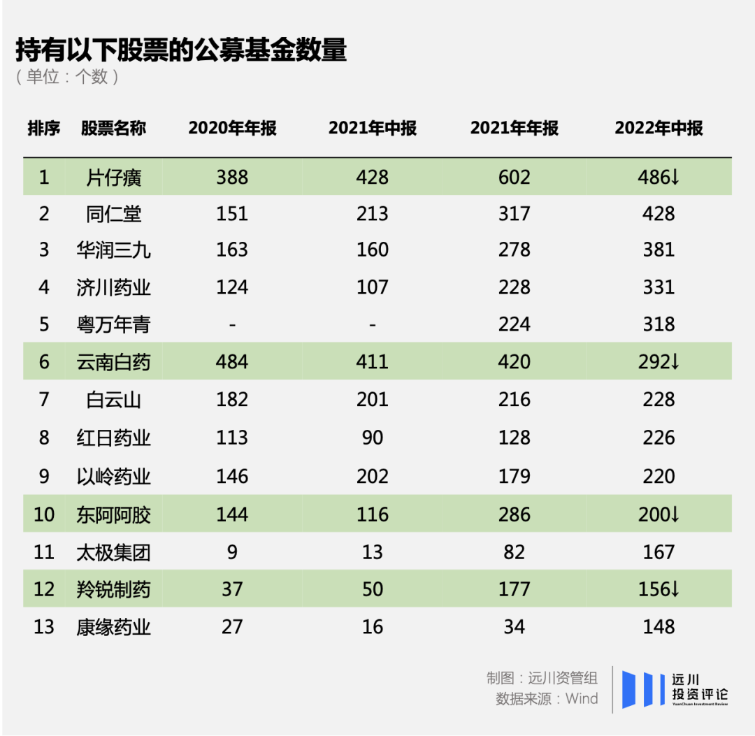 如果我们拿公募基金持股最多的一系列股票来看,2022年二季度布局中药的基金整体上呈现增加趋势。值得注意的是其中对华润三九、济川药业、以岭药业等OTC感冒药投资家数明显增多,对片仔癀以及云南白药等消费型中药持有的机构明显减少。