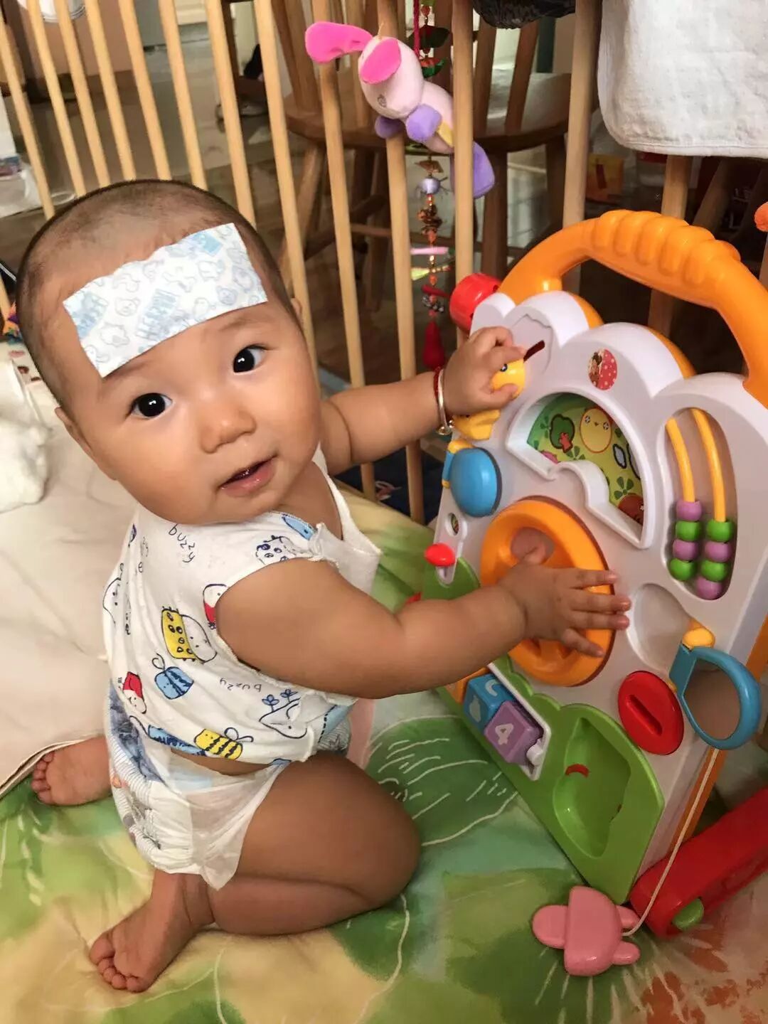 满宝宝发烧的状态依然不错 / 儿童医院等号中