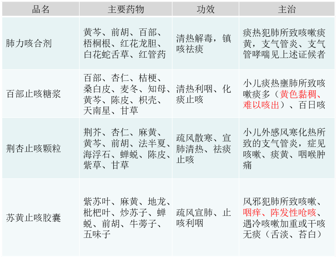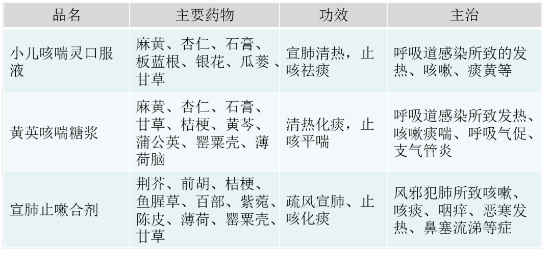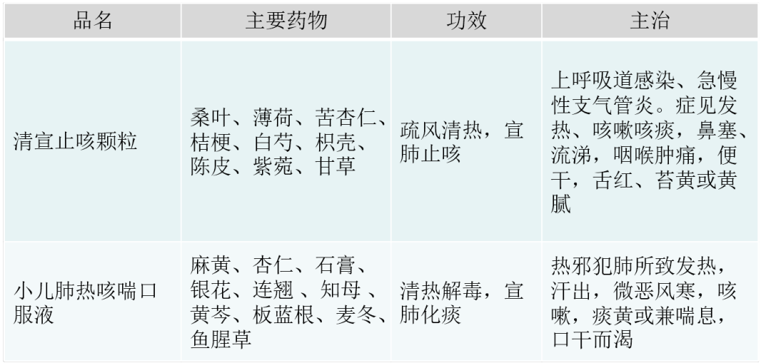 此类中成药治疗急性支气管炎、轻症肺炎属痰热证者,以发热、咳嗽、痰黄、舌质红、苔薄黄或苔黄为主要表现,常用中成药: