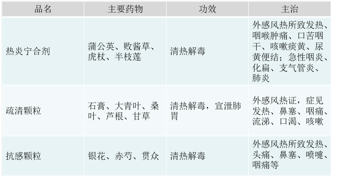 此类中成药治疗流行性感冒热毒袭肺症,小儿以发热、恶寒、头痛、咽痛、咳嗽、鼻塞、流涕、肌肉酸痛,舌质红、苔黄厚或黄腻为主要表现,常用中成药: