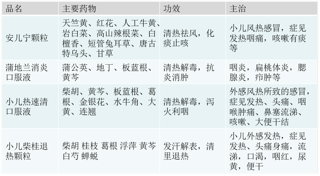 此类中成药治疗急性上呼吸道感染属风热证者,小儿以发热、头痛、咽痛、咳嗽、流涕、舌质红、苔薄黄为主要表现,常用中成药: