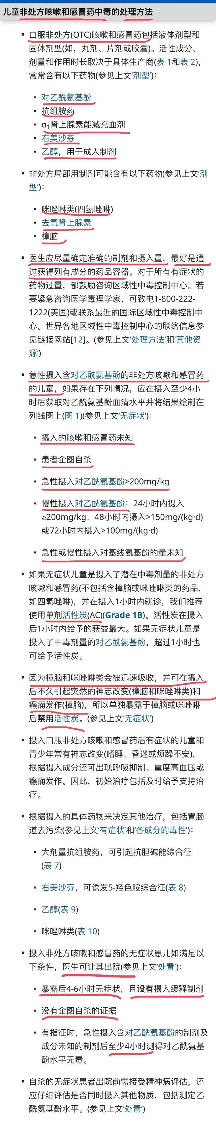 童爸点评:普通感冒一般是病毒感染引起的自限性疾病,不需要吃消炎药(实际上抗生素)。12岁内的儿童一般不推荐吃复方感冒药(包括感冒药、咽炎药和所谓的抗病毒感冒药)。如果发热引起了孩子头痛,可以酌情吃单成分的布洛芬或者对乙酰氨基酚缓解疼痛。很多复方感冒药含有相同的成分(例如对乙酰氨基酚或者马来酸氯苯那敏等),同时使用很容易导致药物过量。孩子的肠胃症状,如果是药物引起来的,那么停止使用药物即可。其实孩子很少本身就有胃病,所以胡乱给孩子吃胃药,又增加了用药的风险。报道里没有说医生如何判断孩子出现了严重肝功能损害,只是说马上让其住院治疗,予以护肝等对症支持治疗。但是也要警惕国内有很多护肝药,其实并没有循证依据,也不推荐孩子使用的。儿童非处方咳啾和感冒药中毒了怎么办?我贴一点UpToDate的科普: