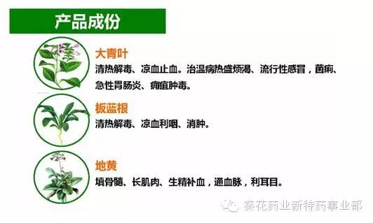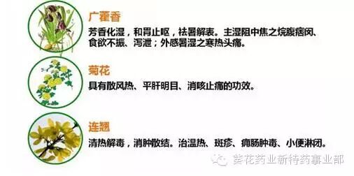 【主要成分】:广藿香、菊花、连翘、大青叶、板蓝根、地黄、地骨皮、白薇、薄荷、石膏。辅料为蔗糖、糊精。