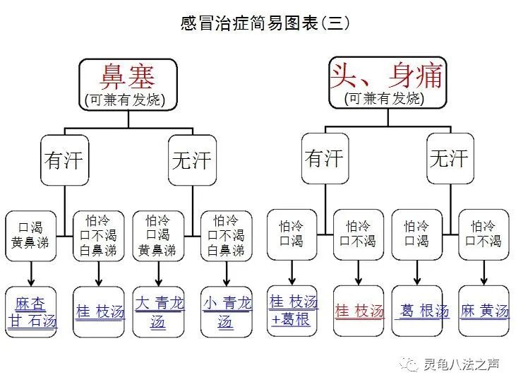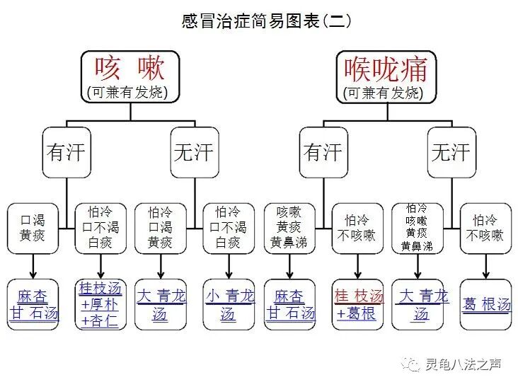 【读图说明】:判断症状的重要性的顺序是自上而下,方法如:由最上方的有汗、无汗开始读起,再依分支症状往下走到对应方剂为止。