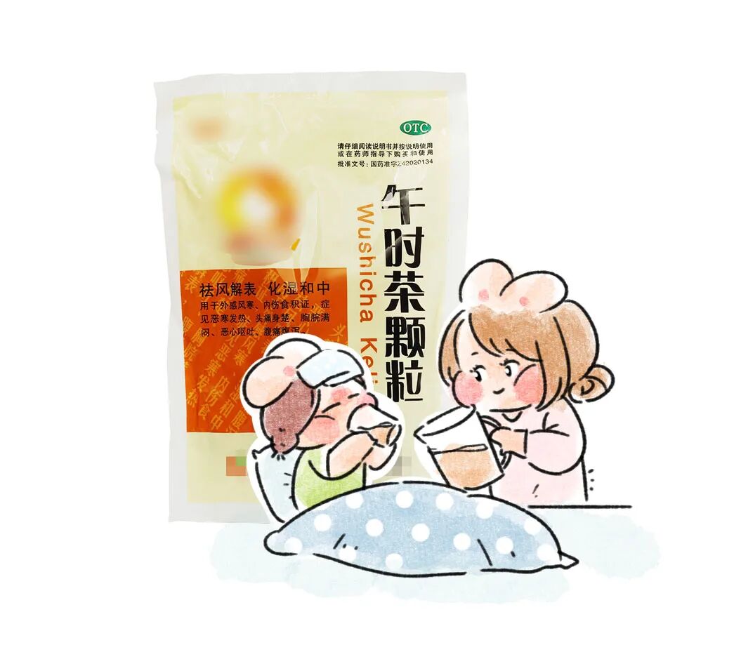 午时茶颗粒,陈茶用来散表邪,解毒疫,健脾和胃,羌活、昂风、苏叶等6味药解表,苍术、厚朴、藿香等5味药化湿,还有山楂、神曲、麦芽消积食,适合积食并伴有外感风寒的症状。