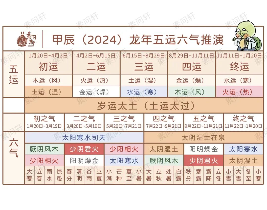 1月20日之后,我们就进入了甲辰年,甲辰年是岁运太土,土运太过,而且上半年司天之气是太阳寒水,下半年在泉之气是太阴湿土,所以整体的气候是偏寒湿的。