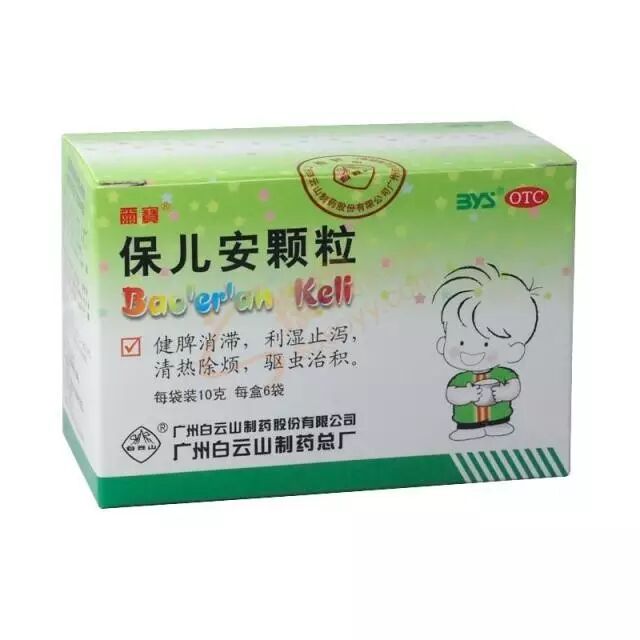 保儿安颗粒的组成为山楂、稻芽、使君子、山楂叶、莱菔子、槟榔、葫芦茶、孩儿草、莲子心。功效健脾消滞,利湿止泻,清热除烦,驱虫治积。用于食滞及虫积所致的厌食消瘦,胸腹胀闷,泄泻腹痛,夜睡不宁,磨牙咬指。