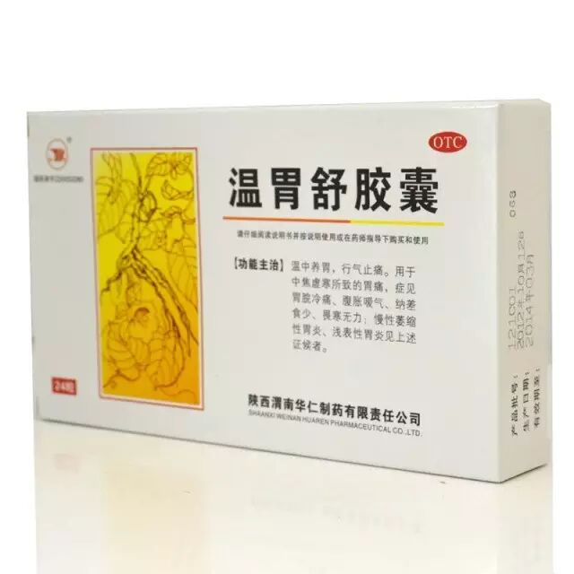 温胃舒胶囊的组成为党参、附子(制)、黄芪(炙)、肉桂、山药、肉苁蓉(制)、白术(炒)、山楂(炒)、乌梅、砂仁、陈皮、补骨脂,功效温胃止痛。用于慢性胃炎,胃脘凉痛,饮食生冷,受寒痛甚。