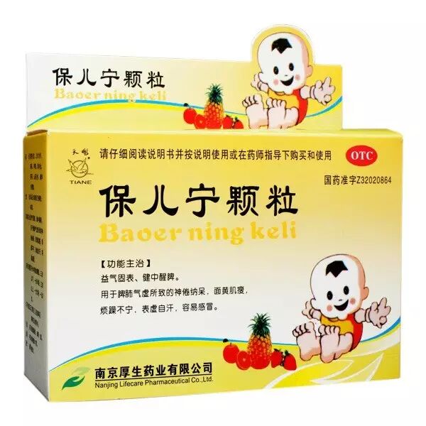 保儿宁颗粒由黄芪(炙)、白术(炒)、防风、芦根、鸡内金、茯苓、山药(炒),功效益气固表,健中醒脾。用于脾肺气虚所致的神倦纳呆,面黄肌瘦,烦躁不宁,表虚自汗,容易感冒。
