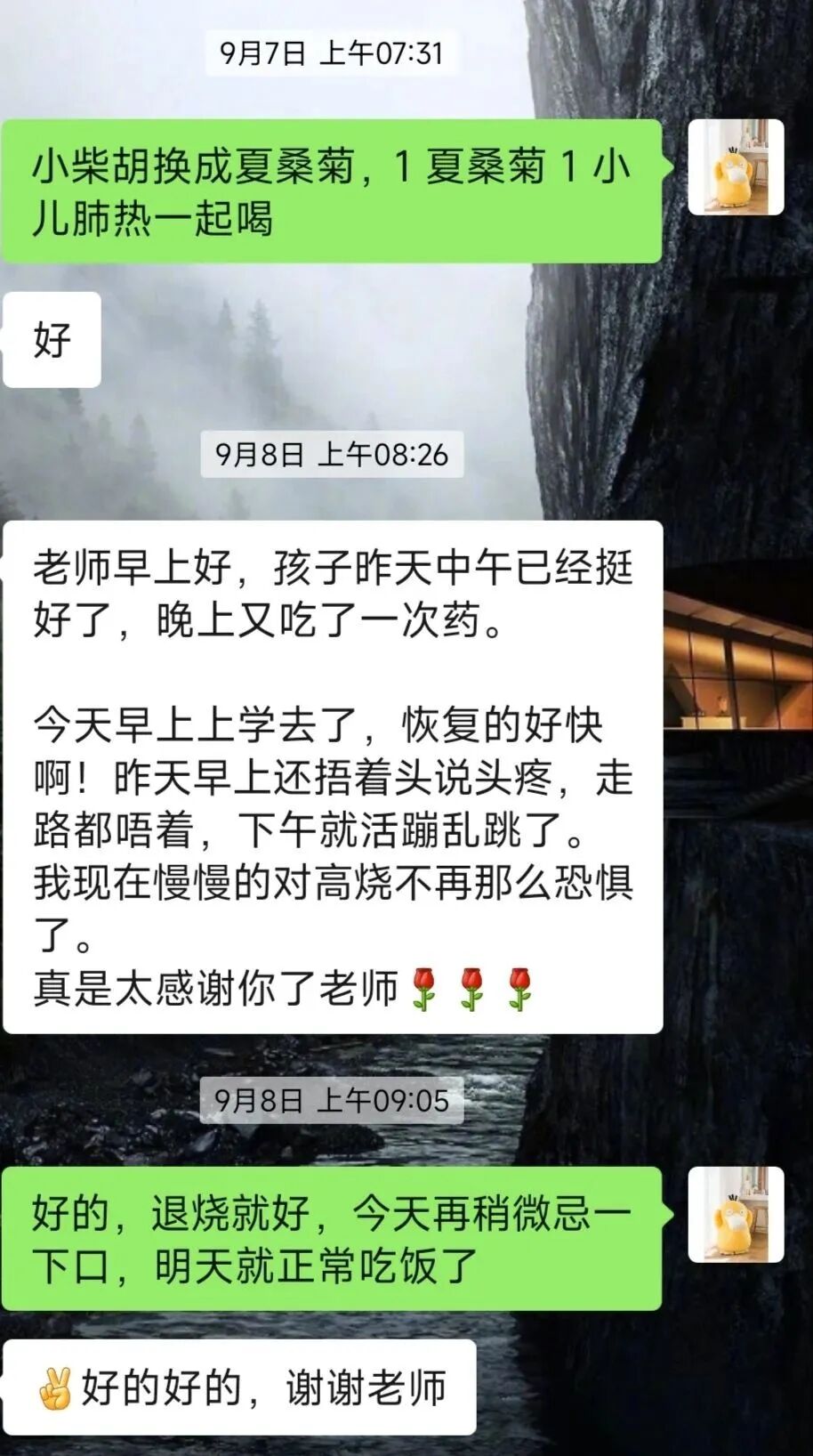 又过了一天,家长就发来了孩子痊愈去上课的反馈了。同时也更加坚定了对中医的信心,对于孩子发烧感冒没有那么恐惧了。