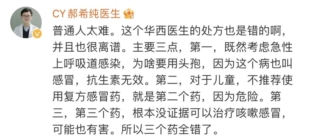 棒棒医生神速,今天已经写了一篇文章——《窥一斑而见儿童上感治疗之乱象》,有兴趣的朋友可以阅读全文了解为什么说华西医院的一级专家的诊治依然是错误的。
