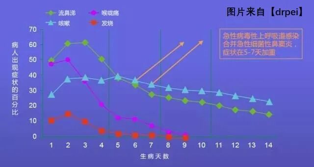 鼻涕:50-60%的患者在前四天出现持续鼻涕,第10天这个比例降低为20%,第14天降低到略高于10%(这时候要怀疑过敏性鼻炎或鼻窦炎)。