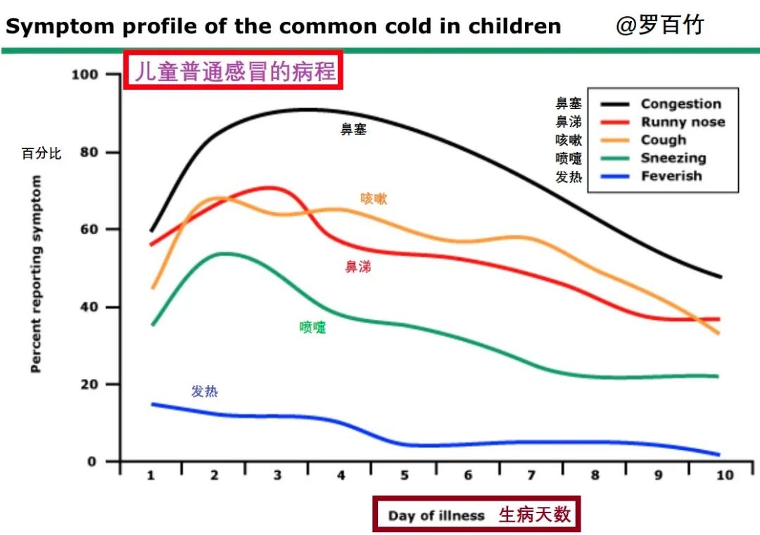 @罗百竹:上图为儿童普通感冒的病程。特别注意咳嗽的数据有个反复的过程,超过40%的孩子第1天出现咳嗽,第2-4天提高到超过60%,甚至第4天还出现了一个小小的反弹,之后咳嗽的比例缓慢下降,一直到第10天还超过30%。咳嗽的数据形象地说明了孩子的咳嗽往往在第3-4天有个加重的自然过程。需要强调的是90%以上的感冒不会出现继发细菌感染,不需要用抗生素,而且6岁内都不推荐使用复方感冒药(例如小儿氨酚伪麻这类药)。感冒时病情往往会在第2-3天开始加重,最明显的是咳嗽,症状的高峰期一般要持续两三天,在第七天之后才开始慢慢改善。感冒并没有特效药,有的人好得快一点,有的人好得慢一点,针对感冒的静脉注射和吃抗生素都没有意义,病好了一般是因为时间到了。咳嗽往往是最后才会消退的症状,有时候需要需2到3周,这是因为病毒可破坏上皮细胞,而机体修复损伤需要时间。