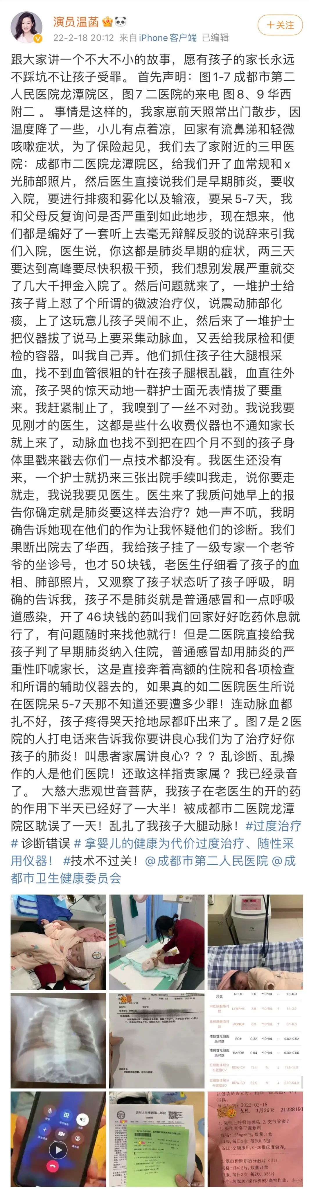 三甲医院不会治疗儿童感冒?这是真的——成都一位女演员在新浪微博上实锤本地三甲医院!新浪微博上认证为演员温涵的一位博主,贴出了自己家孩子先后在成都两家三甲医院就医的对照情况!第一家三甲医院开了血常规和拍片说是早期肺炎,要住院治疗,而且要排痰、雾化和输液,要治疗5-7天,因为要动脉采血,很粗的针往孩子腿上戳,血直往外流,孩子哭得惊天动地!家长果断去了第二家三甲医院挂了一级专家,结果专家说孩子不是肺炎,就是普通感冒!医生开了46元的药让回家吃药观察就好了。