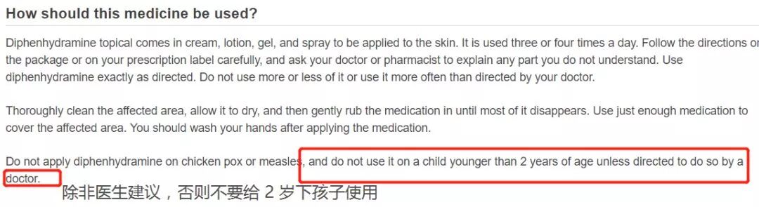 在美国国家医用图书馆的网页里,明确标注不给 2 岁以下孩子外用苯海拉明药物。
