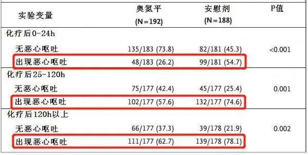 随后,研究人员继续观察两组患者的副作用发生率情况,在化疗后的1-5天里,加入奥氮平的实验组,恶心的发生率从74.6%下降到了57.6%。不仅如此,奥氮平在化疗的各阶段均能有效缓解症状,尤其针对化疗后5天内恶心呕吐效果最好。