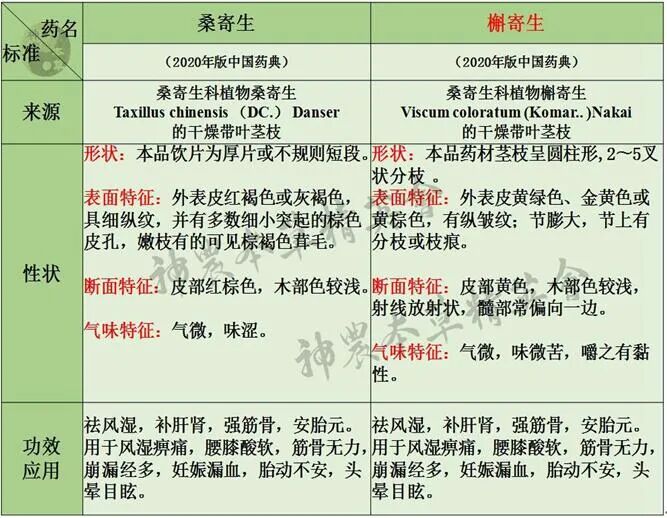 注:传统中医认为桑寄生补肝肾、养血安胎之功较为显著;槲寄生祛风湿、通血脉之力较强。《中国药典(2020版)》一部虽然将两味中药分别收载,但在功效应用项下两者一致,桑寄生和槲寄生功效的区别有待于进一步论证。