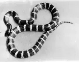 蛇身缠卷成圆盘,蛇背黑环间白环;