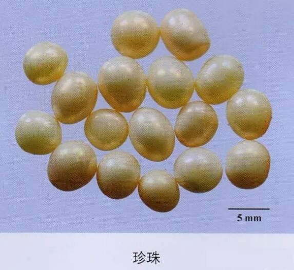 珍珠:具特有的彩色光泽,破碎面显层纹。