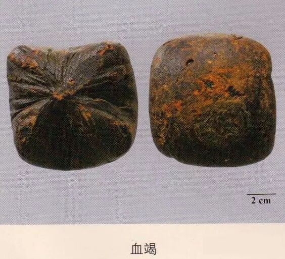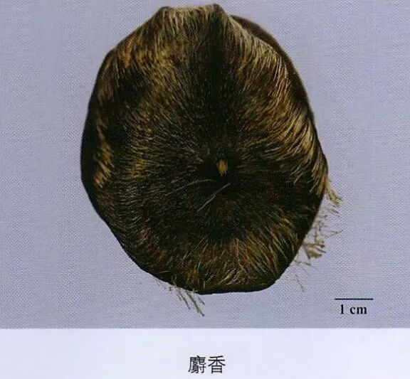 特征:剖开后可见中层皮膜呈棕褐色或灰褐色,半透明,内层皮膜呈棕色,内含颗粒状、粉末状的麝香仁和少量细毛及脱落的内层皮膜,质软,油润,疏松;其中不规则圆球形或颗粒状者习称当门子,气香浓烈而特异,味微辣、微苦带咸。(毛壳麝香,内层皮膜,习称银皮。麝香仁野生品,习称当门子)