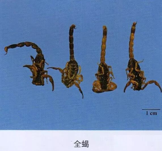 全蝎:前面有1对短小的螫肢和1对较长大的钳状脚须,形似蟹螯,末节有锐钩状毒刺