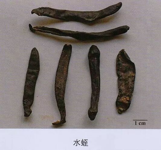 水蛭:黑色斑点排成5条纵纹,两端各具1吸盘。