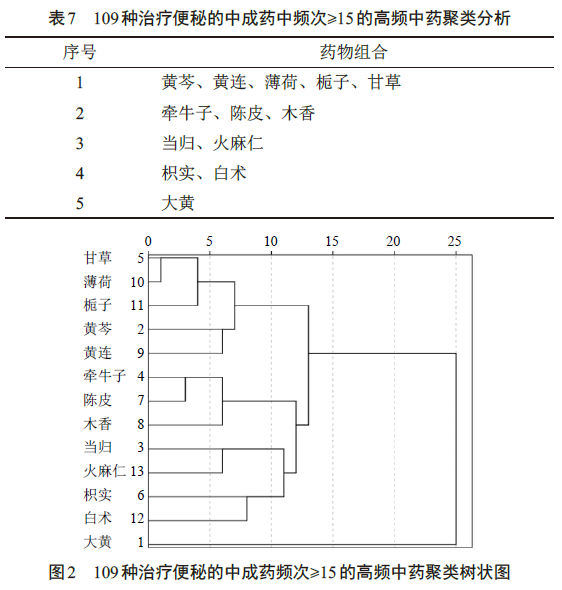 对使用频次≥15的高频中药进行聚类分析,得到5个中药聚合组。第1组主要功效是清热通便,适用于胃肠实热引起的大便秘结;第2组主要功效是行气疏肝、健胃导滞,适用于气郁不舒、消化不良所致便秘;第3组主要功效是滋阴养血、润肠通便,适用于习惯性便秘、老年性便秘及产后便秘等;第4组主要功效是消积导滞、清利湿热,适用于湿热食积所致腹痛便秘;第5组泻下攻积,药效强力,用于胃肠积滞所致实证便秘。