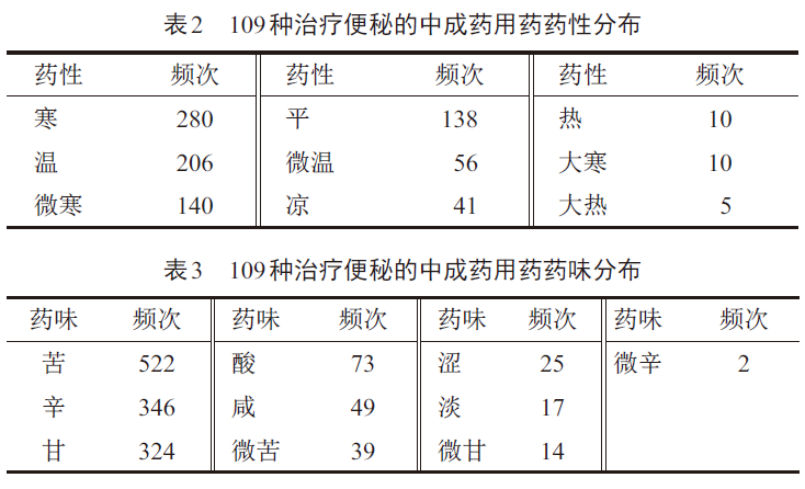 纳入中成药的用药药性以寒、温、微寒、平为多。中药药性反映了药物影响机体阴阳寒热变化的作用,寒为凉之甚,热为温之极,平性具有寒热双向适用的特点,介于寒热两性之间。对于肠胃积热型的实证便秘,寒性药物可以清热通便;对于阴寒积滞型或是阳虚型的虚证便秘,温性药物可达到温里散寒或温阳通便的作用;平性药作用缓和,平补平泻,扶正不留邪,祛邪不伤正。纳入中药药味以苦、辛、甘为多,苦味能泄能燥,辛味能开能散,甘味能缓能补。在便秘的治疗中,苦味药物具有良好的清泻和润燥作用;辛味药物可以活血化瘀,推行气血,增加肠道蠕动,缓解便秘;甘味药物一方面通过补虚治疗虚证便秘,另一方面也可缓和药性,并调和各种药味。本研究中清热药、补虚药、泻下药、理气药较多。临床中,便秘可分为实秘与虚秘,其中实秘又可分为热秘、气秘,虚秘可分为气虚便秘、血虚便秘与阳虚寒凝便秘,故治疗应辨证选用清热、补虚、泻下或理气药物。中药归经代表了某药对某些脏腑经络有特殊的亲和作用,反映了药物药效所在。归经结果表明,本病用药归经以脾、肝、胃经为主。脾之运化、肝之疏泄及胃之受纳功能均与便秘相关。脾运化功能出现问题,或气血不足致大肠失于濡润,均会直接导致便秘;肝失疏泄则气机不畅,气机不畅则推动无力,津血亏虚不能润泽大肠,引发肠燥型便秘;胃受纳功能失司,食物不能正常消化,或胃有实热,煎灼津液,则燥屎内结。