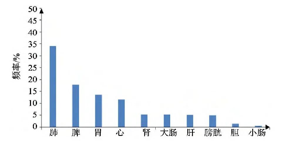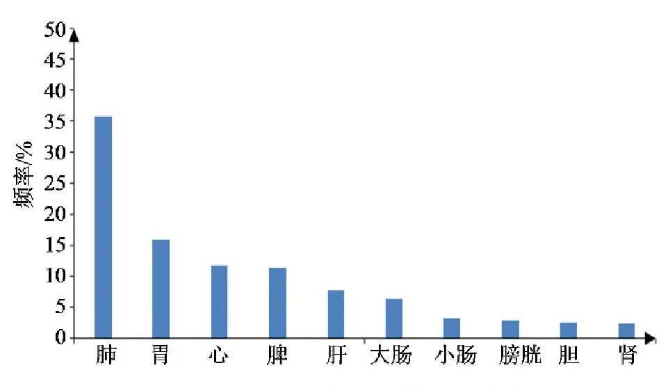 217味中药中使用最多为归肺经药物,占比35.73%,其次是归胃(15.87%)、心(11.65%)、脾(11.39%)经中药,如图5所示。