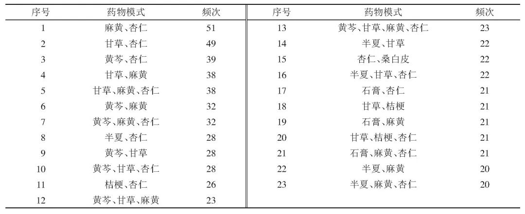 128味中药按使用频数降序排列,使用频率>10%的有28味,排在前5位的分别是:甘草、杏仁、麻黄、黄芩、半夏。使用频率前20位的中药见表8。
