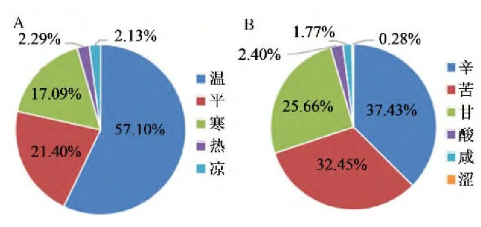 将184味中药的四气五味占比按从高到低排序,四气分布主要以温性药为主(57.10%),其次是平性药(21.40%),再者依次是寒性、热性、凉性药,如图1所示。药味辛(37.43%)、苦味(32.45%)居多,然后是甘味(25.66%),剩下依次是酸、咸、涩味药,如图1所示。