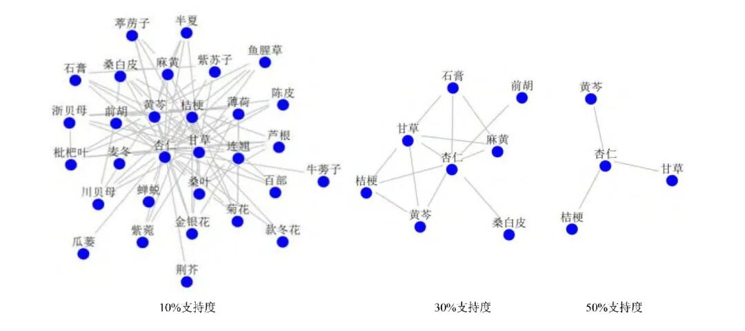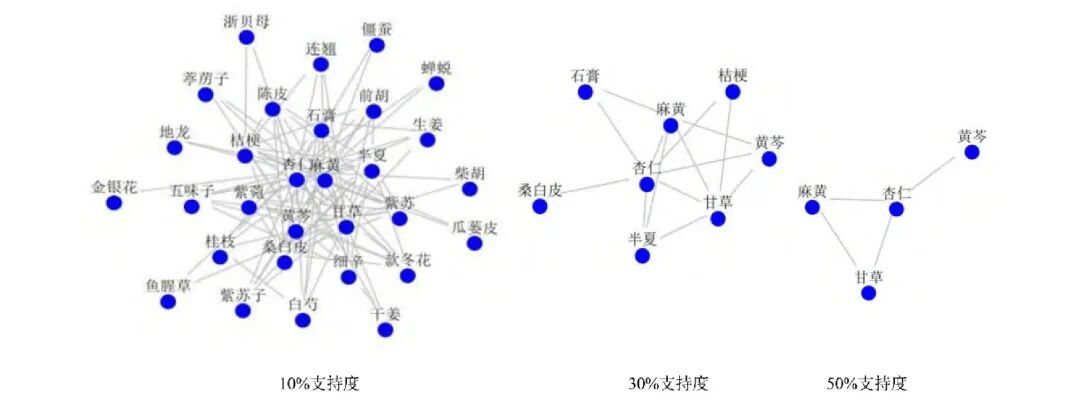 置信度≥0.8,支持度分别设置为10%、30%和50%,得出3种药物组合,其中核心中药有黄芩、杏仁、麻黄、甘草。如图9所示。