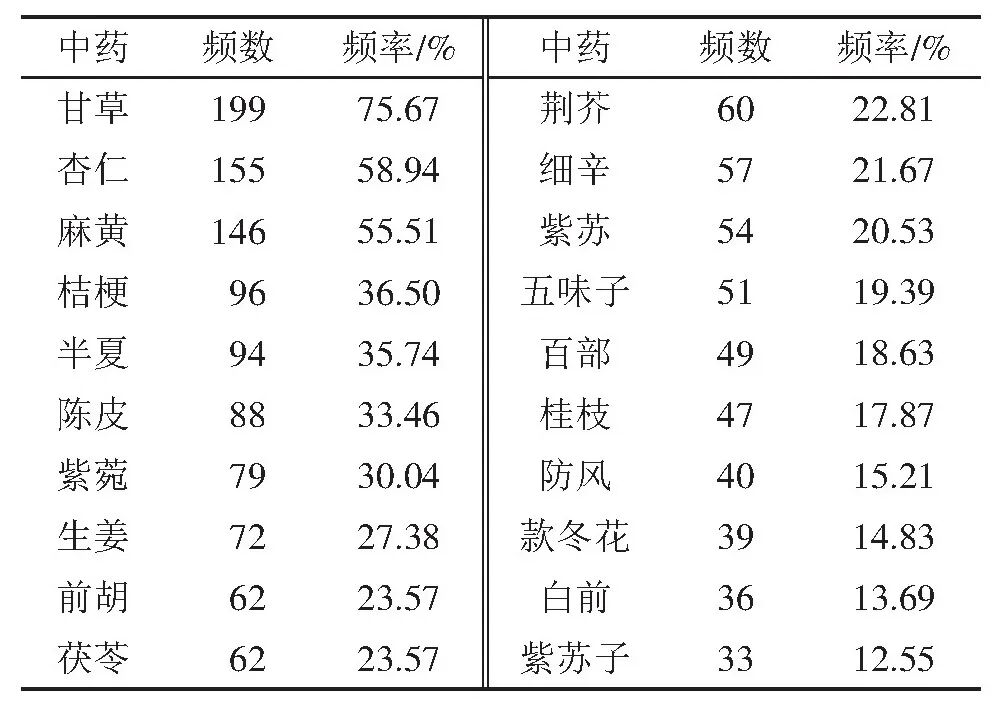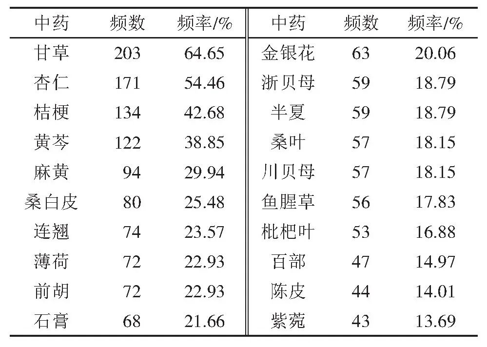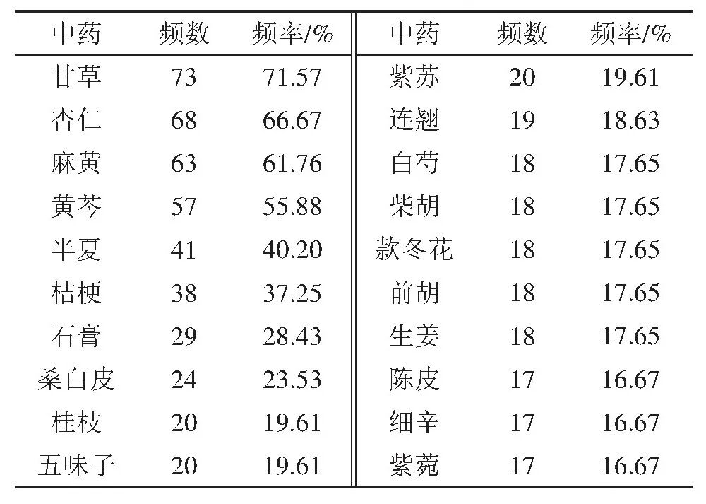 184味中药按照使用频数降序排列,使用频率(频率=单味药使用频数/处方个数)>10%的有25味,频次排在前5位的依次为甘草、杏仁、麻黄、桔梗、半夏。使用频率前20的中药见表2。