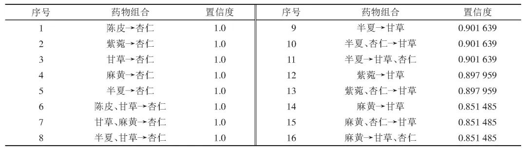 表10 外寒内热型咳嗽治疗处方置信度≥0.8的药物关联规则