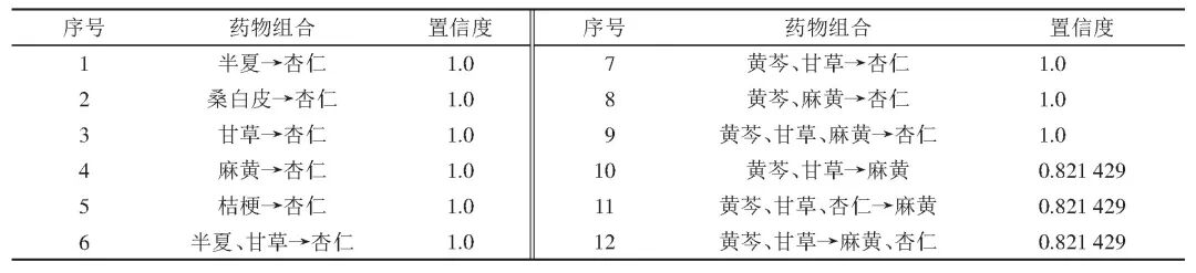 Table 10 Drug association rules with confidence≥0.8 of traditional Chinese medicine prescriptions for treating cough caused by external cold and internal heat drugs