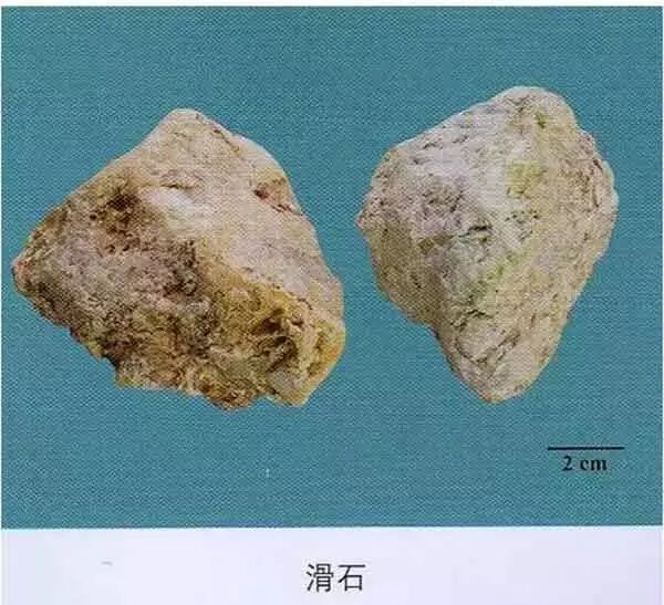 滑石:有蜡样光泽,条痕白色。