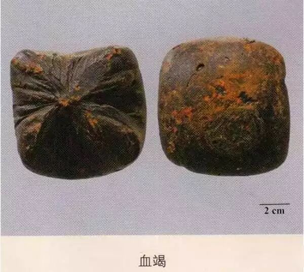 血竭:质硬而脆,破碎面红色。研粉为砖红色