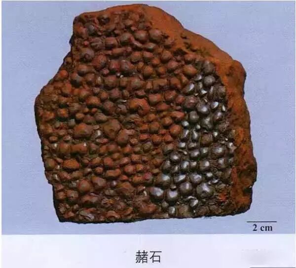赭石:一面多有圆形的突起,习称钉头;另一面与突起相对应处有相同大小的凹窝。