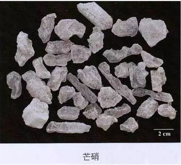 芒硝:暴露空气中则表面逐渐风化而覆盖一层白色粉末(无水硫酸钠),条痕白色。