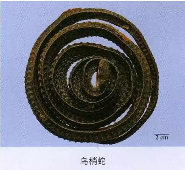 蕲蛇:其头,习称翘鼻头;其背部V形的两上端在背中线上相接,习称方胜纹;腹部,习称连珠斑;尾部,习称佛指甲。